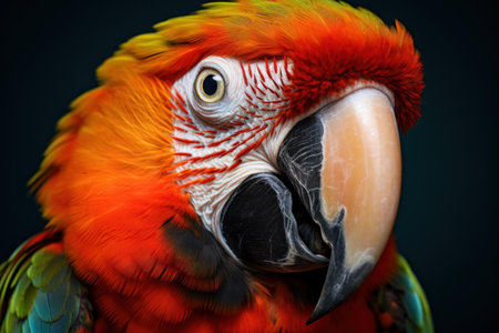 beautiful Scarlet macaw parrot close up portrait on dark background