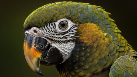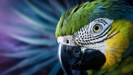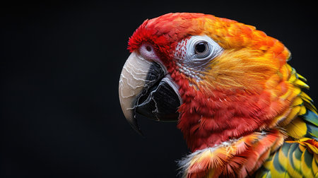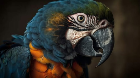 This stunning close-up captures the intricate details of a vibrant parrot with striking feathers against a dark background, showcasing nature's beauty.