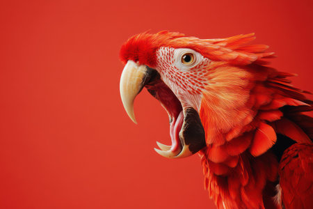 Dramatic close-up of parrot with beak wide open in scream pose, creatively imagined with animalistic aggression on bright color.