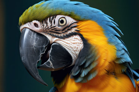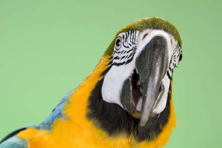 Close up shot of beautiful blue yellow Macaw parrot bird head.