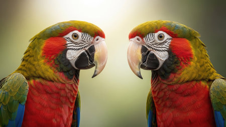 Two vividly colored parrots are depicted in a close-up shot, showcasing their striking red, green, and blue plumage. The parrots are positioned facing each other with sharp beaks and detailed facial features. The soft focus background suggests an outdoor, natural environment, possibly for use in nature, educational, or artistic contexts.