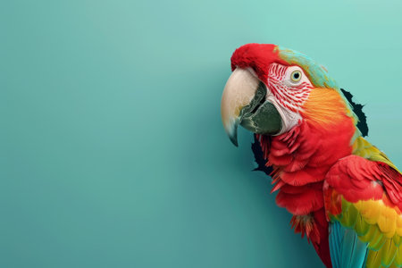 a colorful parrot with vibrant feathers is showcased against a minimalist background. the parrot's feathers display a variety of colors, creating a visually stunning image. the background features a combination of dark red and light azure tones, adding depth to the composition. this 8k 3d photograph is enhanced with cross processing techniques, resulting in a unique visual effect. the artwork is inspired by the realist