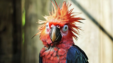 A parrot with wild feathers and unusual eyes poses cutely, showing its vibrant colors against a natural backdrop.