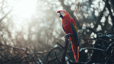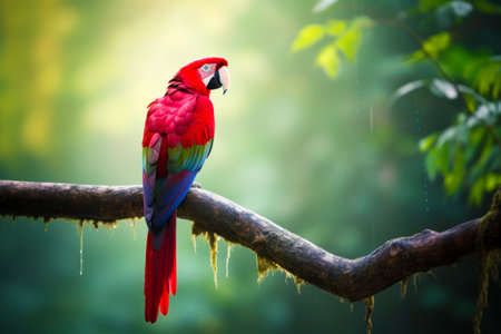 A stunning scarlet macaw with vibrant feathers perches on a tree branch in a serene forest, illuminated by soft sunlight peeking through the foliage.