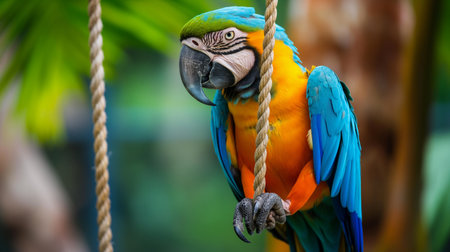 A stunning scarlet macaw perches gracefully on a rope amidst vibrant greenery. This image captures the beauty of wildlife in a serene tropical setting.