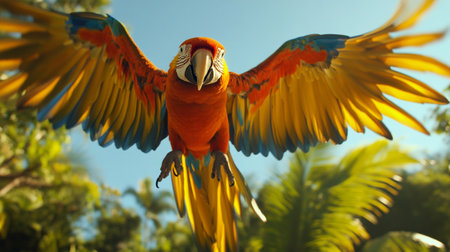 beautiful Scarlet macaw bird flying in the blue sky, close up