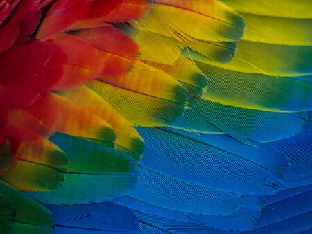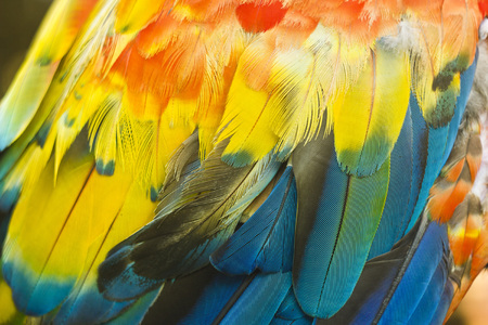 Colorful bird feathers background, closeup of beautiful colorful bird feathers
