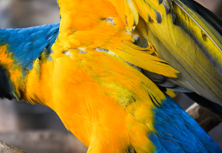 colorful of blue and gold macaw bird feathers wing. exotic nature background and texture.