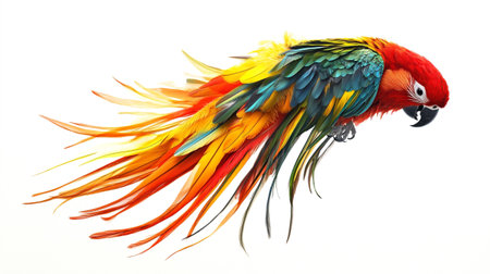A beautifully colored macaw rests calmly, displaying its bright plumage of green, blue, red, and yellow feathers. Its expressive eyes reveal a curious and lively spirit, bringing joy to viewers.