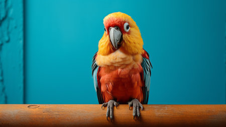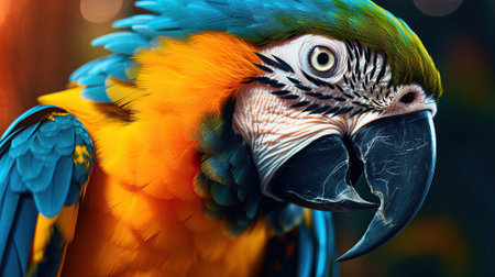 tropical colorful parrot with blue green and yellow feathers on a dark blurred background