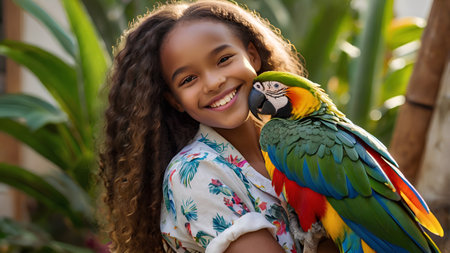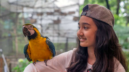 happy young woman in safari suit with parrot on shoulder in jungle