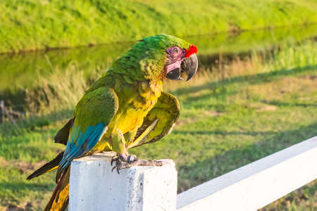 Macaws parrot perched on a wooden rail. At the bird show