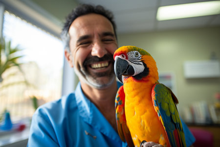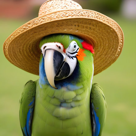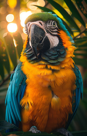 A beautifully colored macaw rests calmly, displaying its bright plumage of green, blue, red, and yellow feathers. Its expressive eyes reveal a curious and lively spirit, bringing joy to viewers.