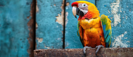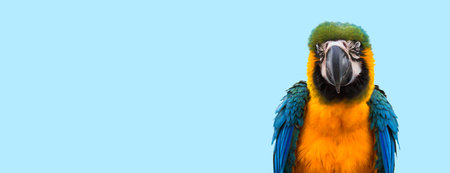 Happy blue gold macaw parrot bird on isolated blue color background, banner size
