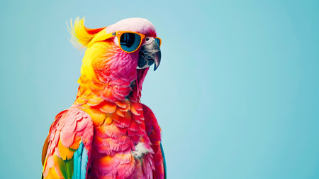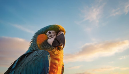 Big green parrot against blue sky, copy space