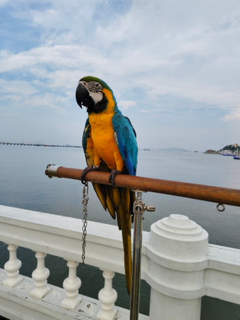Macaw bird on bird's perch in public park beside sea and sky background.