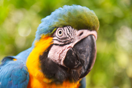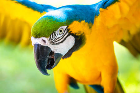 Close up Blue and gold macaw parrot head. Exotic colorful African macaw parrot, beautiful close up on bird face over natural green blurred soft background.