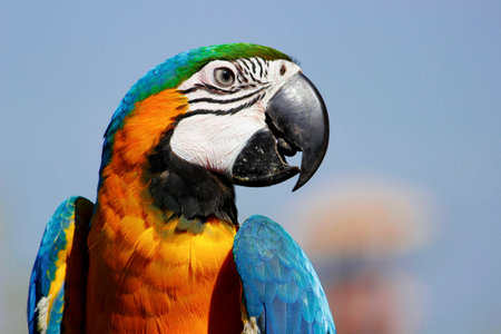 A selective focus of the face of a macaw against a blurred background
