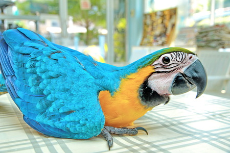 3 Months male blue and yellow macaw parrot in house. Bird sitting on a dining table legs and wiggle sound as a child in a good mood. Selective focus.