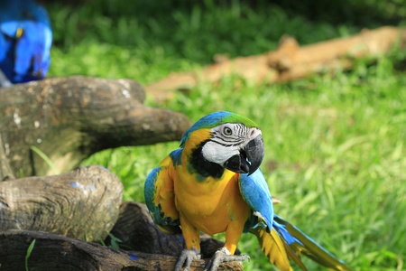 Blue-and-yellow macaw (Ara ararauna), big clever bright parrot.