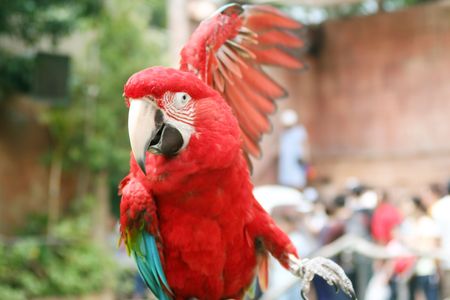 Brightly red colored parrot showing his wing.