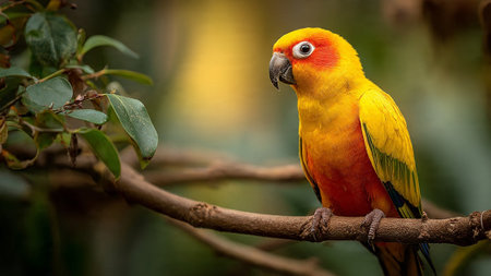 Bright yellow, orange, and green parrot sitting on brown branch with green leaves