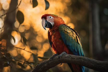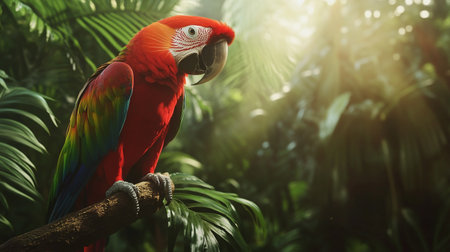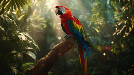 beautiful Scarlet macaw on branch in the rainforest with sunlight