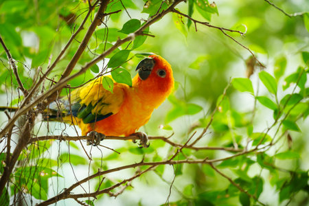 Sun Conure or Sun Parakeet stands on a tree at horizontal composition