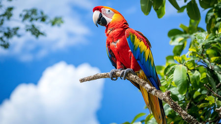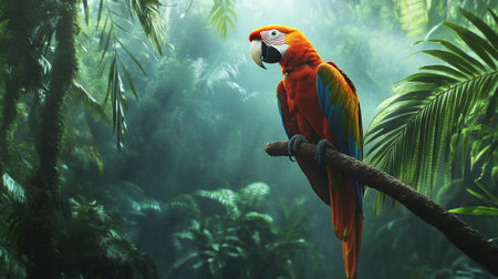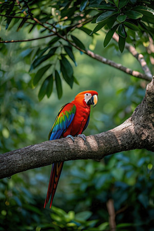 beautiful Scarlet macaw sitting on a branch in the rainforest