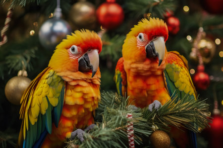 Blue Macaw Perched on Snow-Covered Branch. Concept of vibrant wildlife, tropical bird, winter decorations, festive lights, Christmas.
