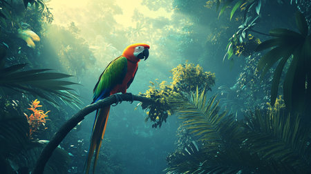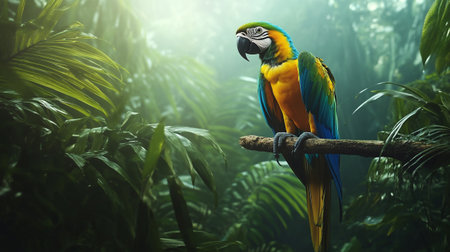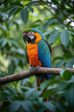 Colorful parrot sitting on a branch surrounded by vibrant green foliage in a tropical forest setting.