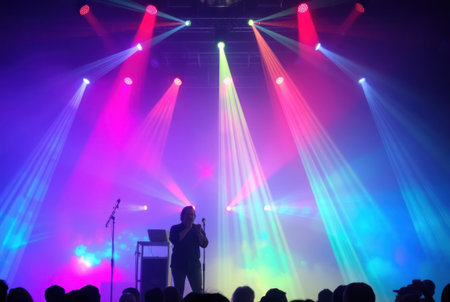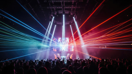 A lively concert scene with a large crowd of people enjoying the performance. The stage is illuminated with vibrant laser lights in various colors, creating a dynamic and energetic atmosphere.