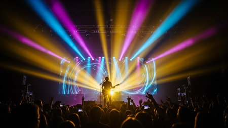 Live Concert Energy: Musicians on stage, vibrant light show, sound waves rippling through the crowd.