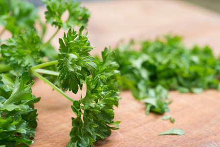 Fresh green parsley close up on wood desk. Food ingredients