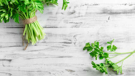 Bunch of organic parsley on white wooden background