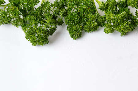 Fresh organic parsley leaves and sprigs on white background. Use as herb in cooking or garnish for dishes.
