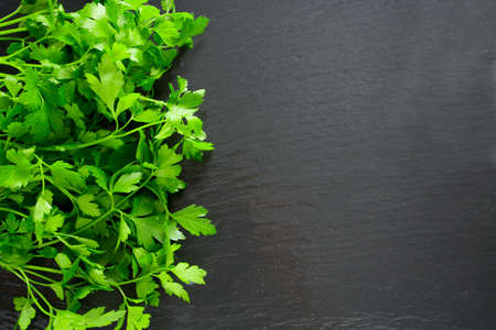 Fresh parsley on black background. Healthy food concept. Top view.