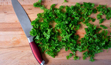 Parsley. Finely chopped parsley for salad. Greens on a cutting board.