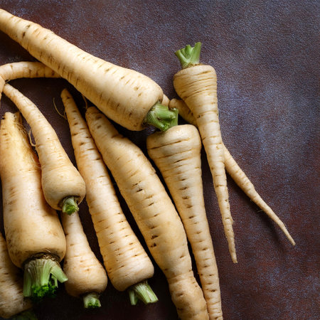 AI Generated. Fresh parsnip roots on marble background promoting healthy eating and natural ingredients top view