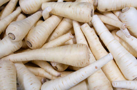 Background and close up of white parsley root, in the market, photographed from above