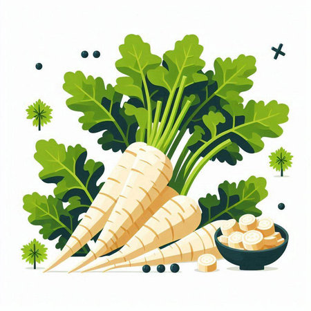 Fresh parsnips with green leaves on white background. Vector illustration.