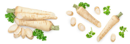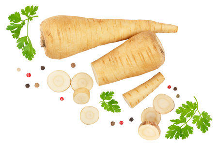 Parsley root with slices and leaves isolated on white background, Top view. Flat lay
