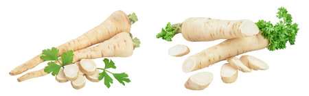 Parsnip root and slices with parsley isolated on white background closeup, Set or collection