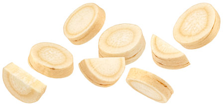Falling parsley root slices isolated on white background