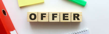 Wooden cubes with word OFFER on the office desk. Folder and other office supplies. Work space.