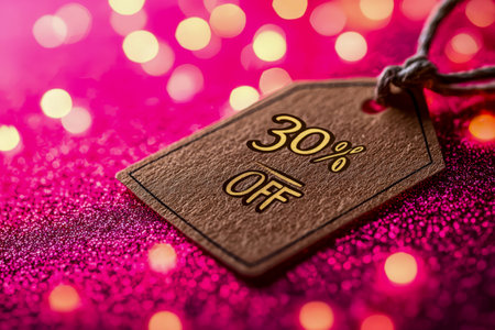 A sparkling pink backdrop filled with shimmering bokeh lights showcases a bold sale tag offering a premium 30% reduction, ideal for festive promotions