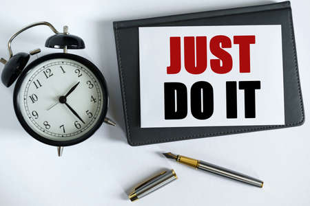 Business and positive concept. On the table there is a clock, a pen, a notebook and a card on which the text is written - JUST DO IT