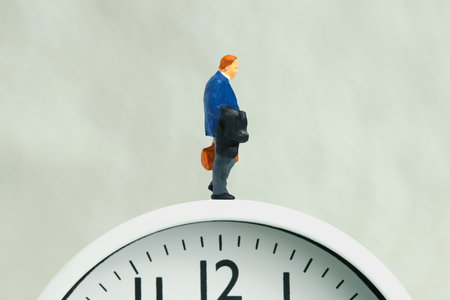 Miniature people toy figure photography. Tired of working overtime concept. A businessman standing above clock. Image photo