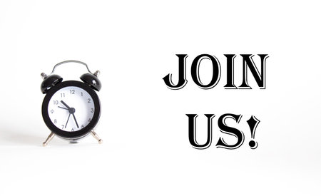 Join us symbol. Concept word Join us on Beautiful white background with alarm clock. Business and Join us concept. Copy space
