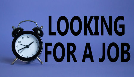 Looking for a job symbol. Concept words Looking for a job on wooden blocks. Beautiful blue background with alarm clock. Business and Looking for a job concept. Copy space.